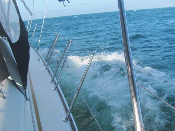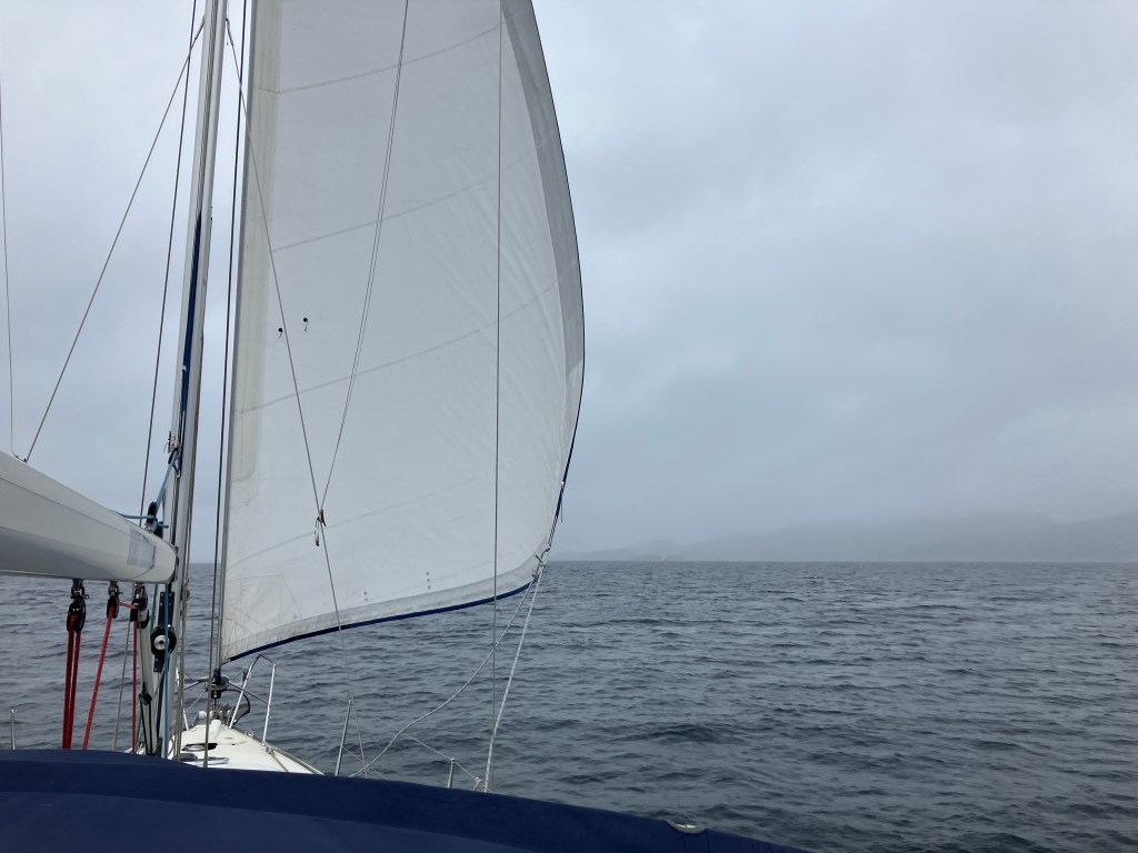 We frantically prepare everything to leave. Fifteen minutes later, we slip the lines and head out of the harbour. The wind is just enough off the bow to allow us to sail close-hauled.