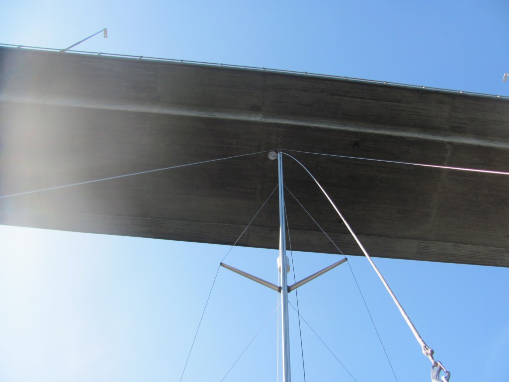 We reach the bridge. From down on the boat, it looks as if the mast won’t fit under. It always does. But in this case, there isn’t much room for error. I slow down and edge our way forward. Visions of the mast hitting the bridge and crashing down on top of us enter my mind. I decide to look straight ahead and trust that my figures are correct.