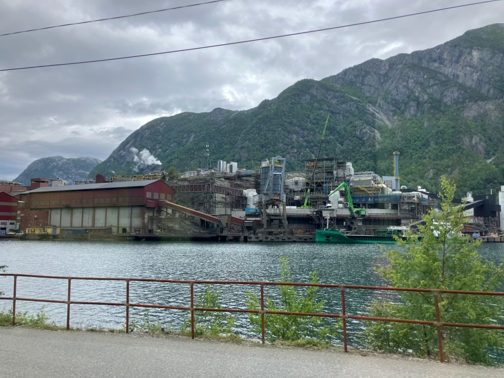We eventually emerge from the tunnel, our eyes blinking as they adjust to the light. Initial impressions are not positive. The first thing we see is a huge industrial complex on a small island in the middle of the fjord. It turns out that it is a Boliden zinc smelter.