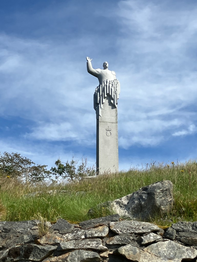 “It says that it is Leif Erikson”, I say. “He’s thought to be the first European to set foot in America. Apparently he was converted to Christianity by Olav Tryggvason here in Trondheim, and told to go and convert the Greenlanders. Unfortunately he was blown off course, and landed up in America. He did eventually return to Greenland and fulfilled his task of converting them.”
