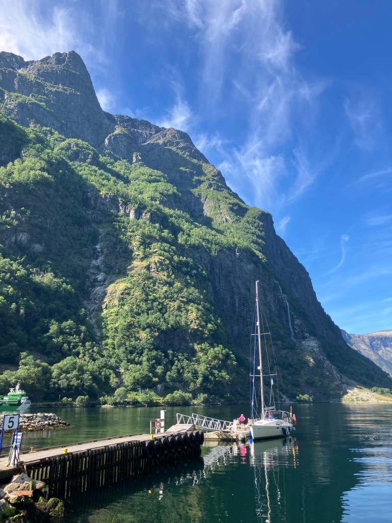 “We had a bit of a mishap when we left Hekla in Aurlandsfjord”, Bob tells us. “We were tied up to a pontoon there, and at some stage one of those high-speed ferries must have been too close. The wash from it rocked Hekla up and down, and somehow one of the gunwales got wedged under the pontoon and did quite a bit of damage. We’re looking to see if we can find a boatbuilder near here to repair it.”