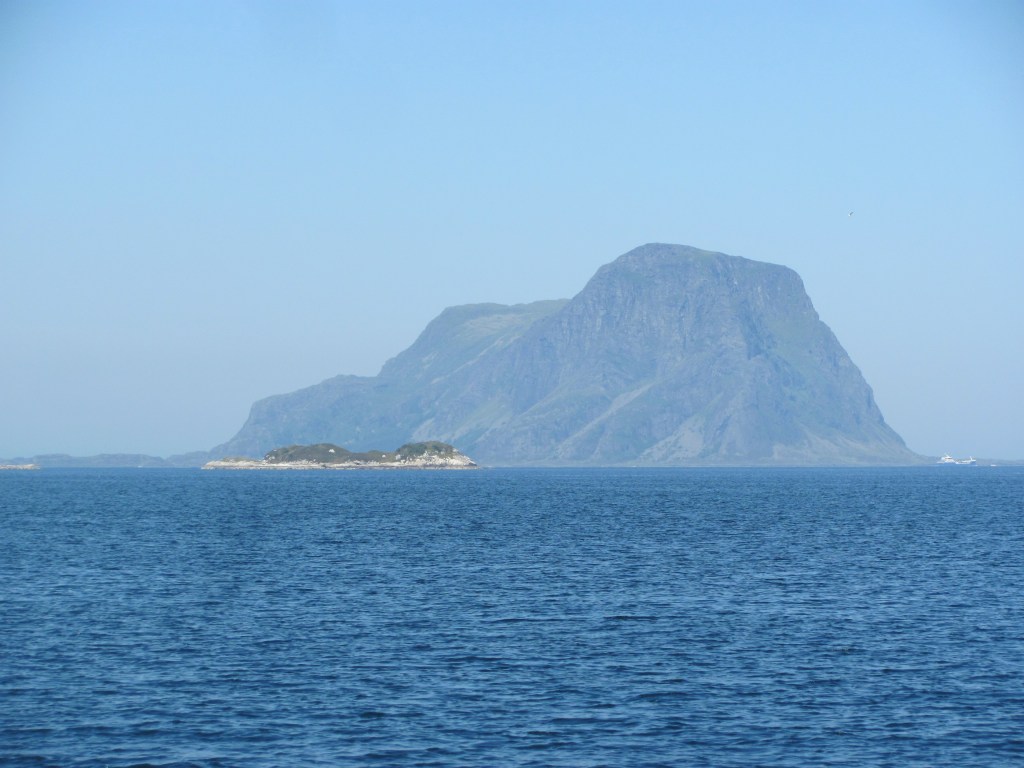 As we sail up Trondheimsfjord, the Hurtigruten ship comes up behind us. As it passes, two men lean over the rail at the back and wave.