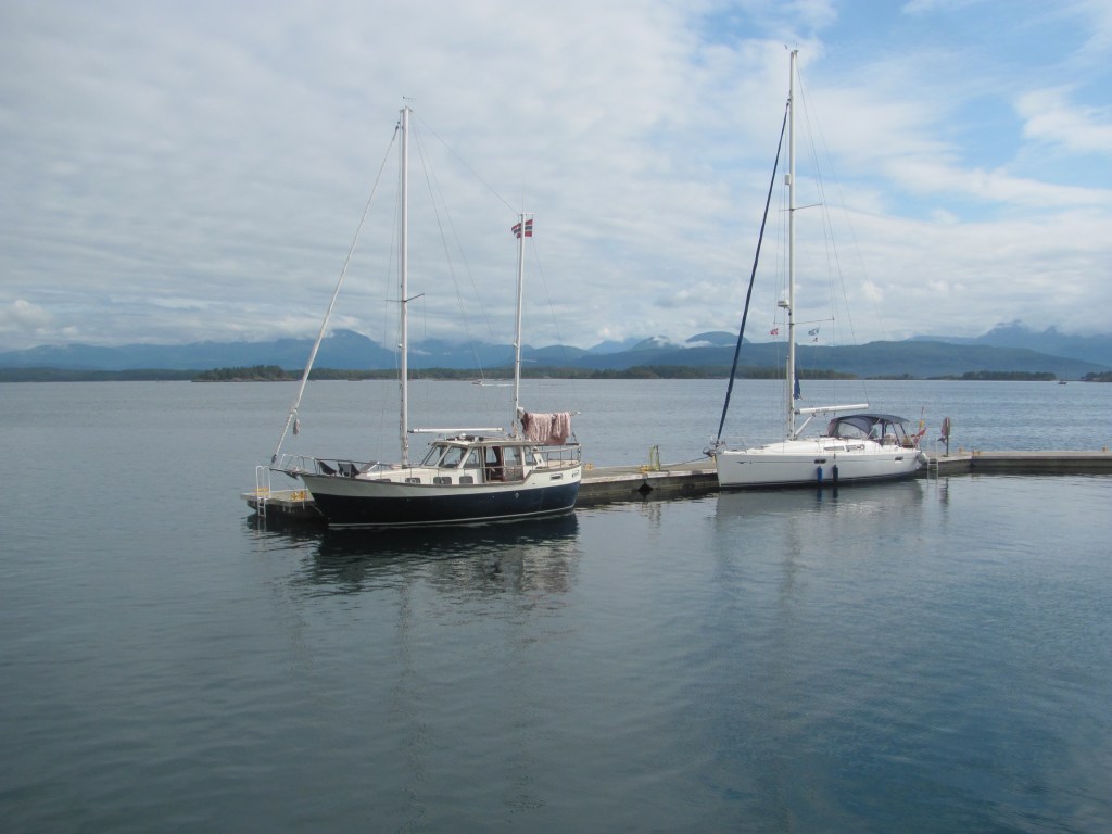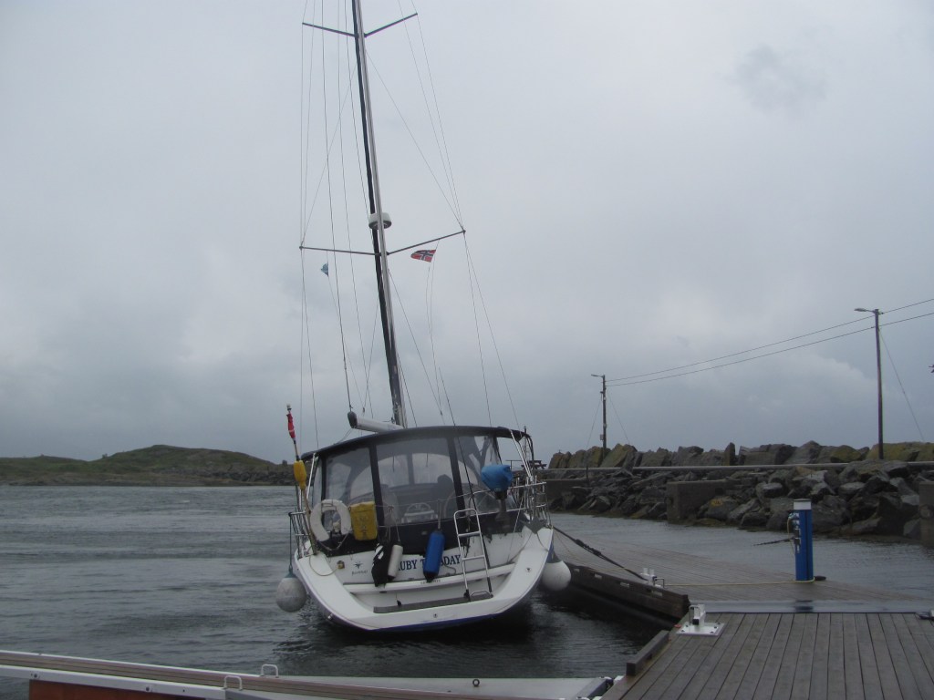 Somehow we manage it, and are on the other side. We tie up to the outer pontoon in the small harbour, with a few minutes to spare before 1400. I look around to see if I can see a riggery looking person, who might be waiting for us.