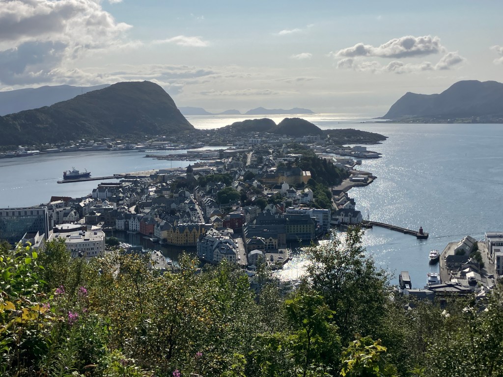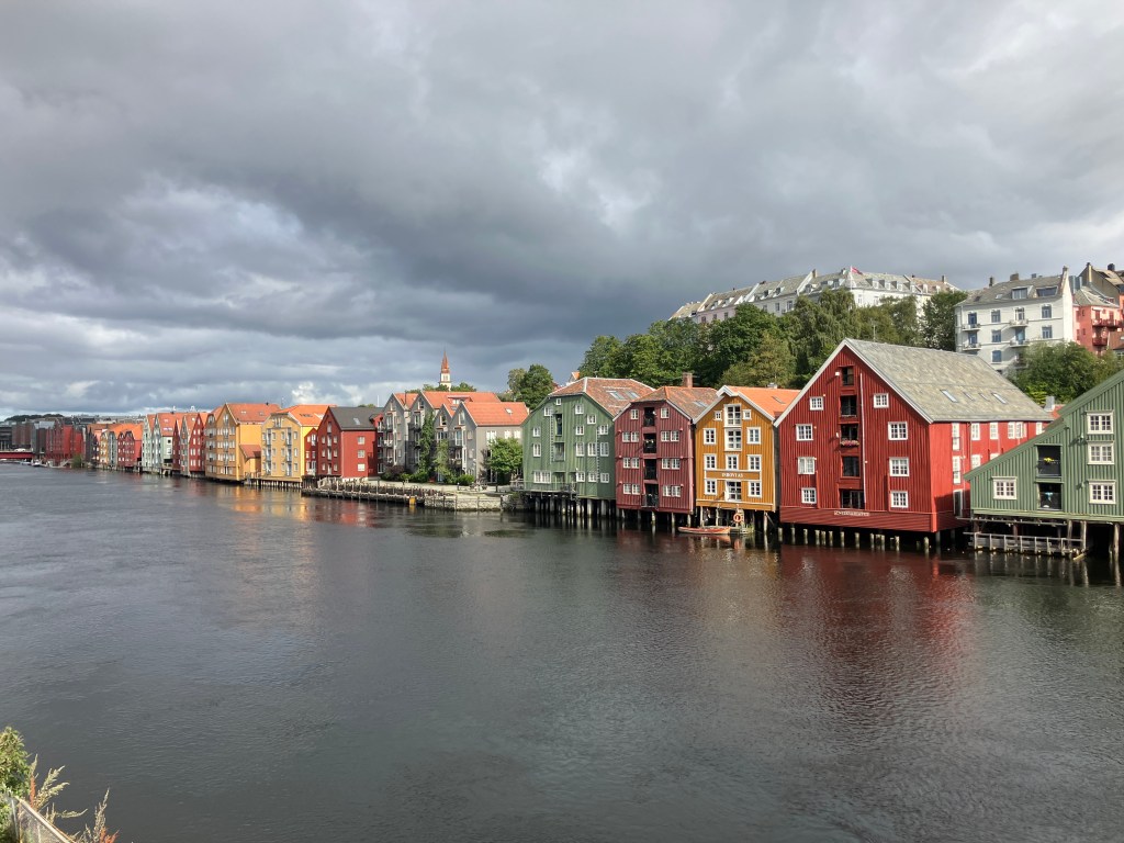 “Look, you can see the Gamle Bybro bridge where we crossed over the Nidelva river”, I say, pointing to the bottom of the hill. “And the old town of Bakklandet with all its colourful houses. They look beautiful in the sunlight.”