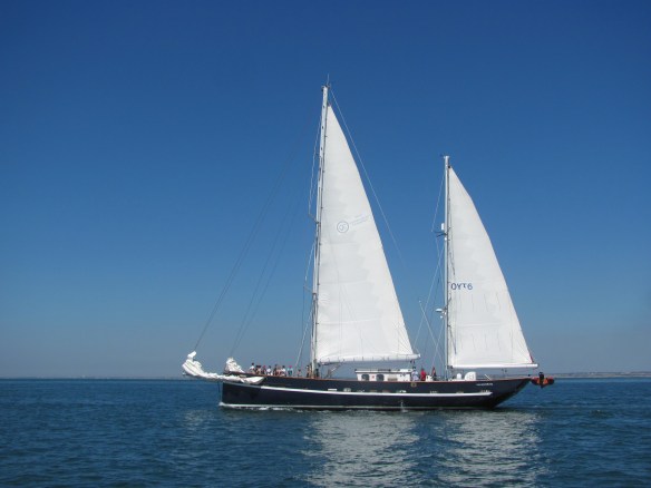 We had arrived in Poole the night before. We had left our paradise on the Beaulieu River in the morning, and had caught the start of the west flowing current down towards the Needles. Before long we were passing Yarmouth to our left, then Keyhaven to our right, each with their respective fortifications guarding the entrance to the Solent, Fort Albert and Hurst Castle. At some point we had noticed a tall ship following us and hoped that she would catch us up so we could get a good view of her.