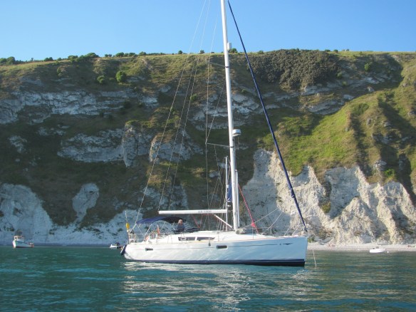 It has been a rough night. The wind had gone around to the north at some point and had strengthened. Rather than being sheltered from northerly winds in Lulworth Cove as one might expect, it seems to act as a funnel instead. I had checked our position a couple of times during the night and we had seemed fine, but when I check the chart-plotter now I see that we have definitely moved from where we had anchored the night before. It seems the anchor has dragged, and we are closer to the rocks at the entrance to the Cove now. We decide to leave now rather than trying to re-anchor.