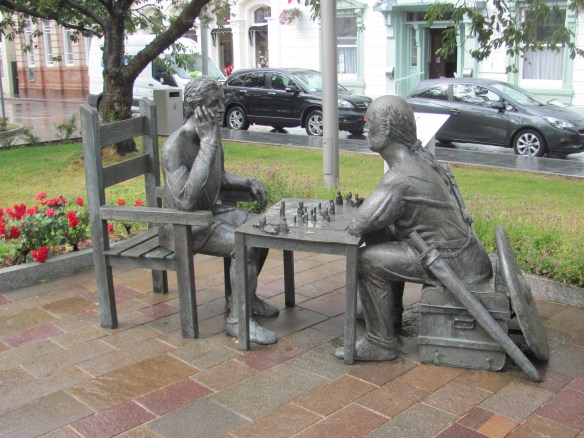 Back on the road, we catch the next bus which takes us to the stop for the Giants’ Causeway, and we walk the kilometre or so down to the coast. The stones are part of the same geological structure as the structures at Staffa, and were formed by volcanic activity around 60 million years ago. When lava cools slowly, it forms hexagonal columns. Legend has it that the Causeway was built when a giant from Ireland was challenged to a duel by a giant from Scotland, and the latter needed a way of getting across to the bout. We were amused to hear that DUP ministers had insisted on a Young Earth Creation explanation in the Visitors’ Centre of the formation of the stones 6000 years ago. What’s a factor of 10,000 amongst friends?