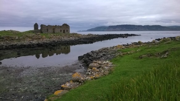 We reach the harbour in one piece and disembark. There is still time, so we decide to walk down to the southern lighthouse at Rue Point. On the way, we pass Richard and Maryanne, our marina neighbours in Ballycastle, who had also come over the day before, earlier than we had. At the point, the light is beautiful and we sit next to the ruins of a cottage and look out across Rathlin Sound to Fair Head on the other side. A tall ship with square-rigged sails passes gracefully by, heading north-eastwards. Below us, in a small bay, seals sunbathe on the rocks, looking like bananas with their heads and tails curved, while goosander ducks cluck fussily and dive for their dinner. It could be the land that time forgot.