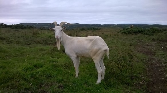 An aggressive-looking goat bars the way. It reminds me of a story I used to read when I was a child about some trolls trying to cross a bridge blocked by a fierce Billy Goat Gruff. Or was it the other way round? In any case, I manage to convince the goat that the beautiful maiden behind me will be much tastier than me. He lets me pass. The First Mate approaches, following my tracks. The goat nonchalantly looks the other way, and starts grazing.