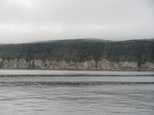 That’s the theory at least, and this time it seems to work. The eddy current takes us along the cliffs that we had walked the day before, the dark basalt overlaying the white lay of chalk underneath. Charles Kingsley apparently described Rathlin Island as a drowning magpie because of this layering, but it reminds me more of a layered chocolate cake with a tasty cream layer in the middle.