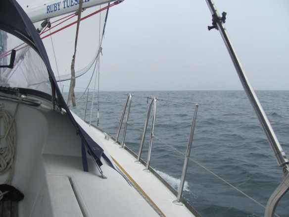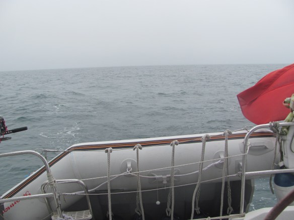 A strong wind is coming from the west, and we set a course northwards through the mist. Gradually Rathlin disappears and we are alone again on the sea. As we are crossing a shipping lane, we keep an eye on the radar and AIS to make sure there aren’t any large ships about to run us down. The First Mate goes inside to keep warm.