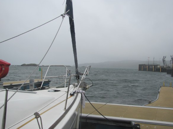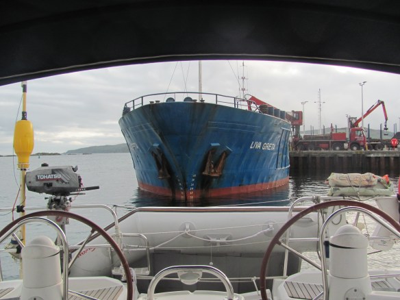 The morning arrives and I feel grumpy. The cargo ship loading logs leaves and there is now space for us to move out, but its departure has made us even more exposed to the strong winds and waves from the west. Luckily several of our neighbours are on hand to help us, so we reverse out of our berth and motor around to the other side of the pontoon. It’s not as easy as it sounds as the wind is still very strong, and it takes a major effort to avoid being blown onto the edge of the pontoon and into the other boats. Eventually however, helping hands guide us in and we are tucked up safely and soundly in our new position. The slapping almost stops, and some of my grumpiness disappears.