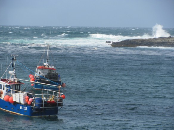 We explore the village. There is a picturesque little harbour with fishing boats bobbing up and down, and about three or four seals looking inquisitively at us. The harbour is protected from the outside sea by two islands with a narrow gap between them. On one of the islands stands a lighthouse. Today it is rough, with waves breaking over the bar between the two islands and bringing surges into the harbour. Whitewashed houses surround the harbour on both sides, with more spilling down from the slopes behind. A solitary post-box provides a splash of red. One or two people can be seen, but there is an overwhelming feeling of isolation, as though this is the end of the world. Just the deep blue ocean from here on.