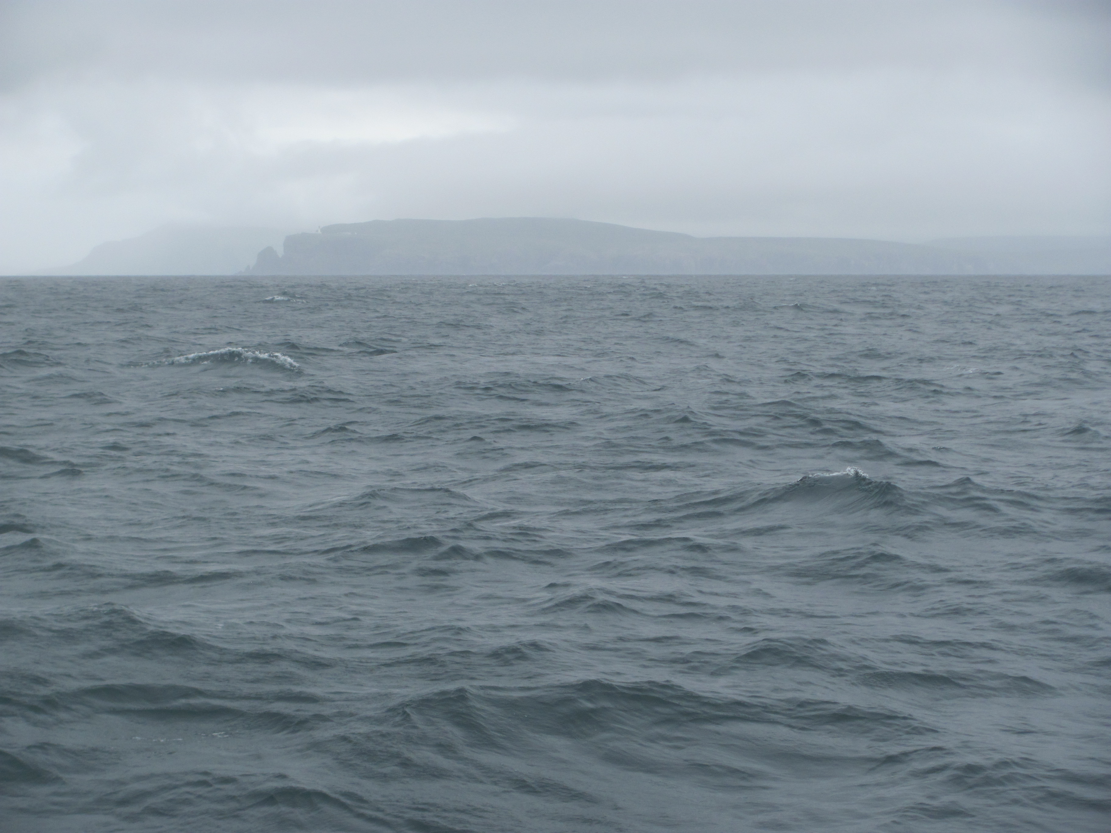 Sure enough, bleary-eyed, we are carried out of Hoy Sound by the west flowing current at around 9 knots. We pass the Experimental Wave Zone where there is research going on to generate power from tidal action, and head north. As expected, the tidal flow changes so that we are carried north to Brough Head lighthouse. The wind is from the south-west, directly behind us, so we only have the mainsail out, still making good speed. A pod of dolphins follows us for a short time then disappears. We arrive at Brough Head and turn to starboard, where the flow now takes us eastwards into Eynhallow Sound. From there, it is an exhilarating sail down the Sound at 10 knots dodging all the rocks, skerries and shoals inconveniently put in our way by some malign gamester.