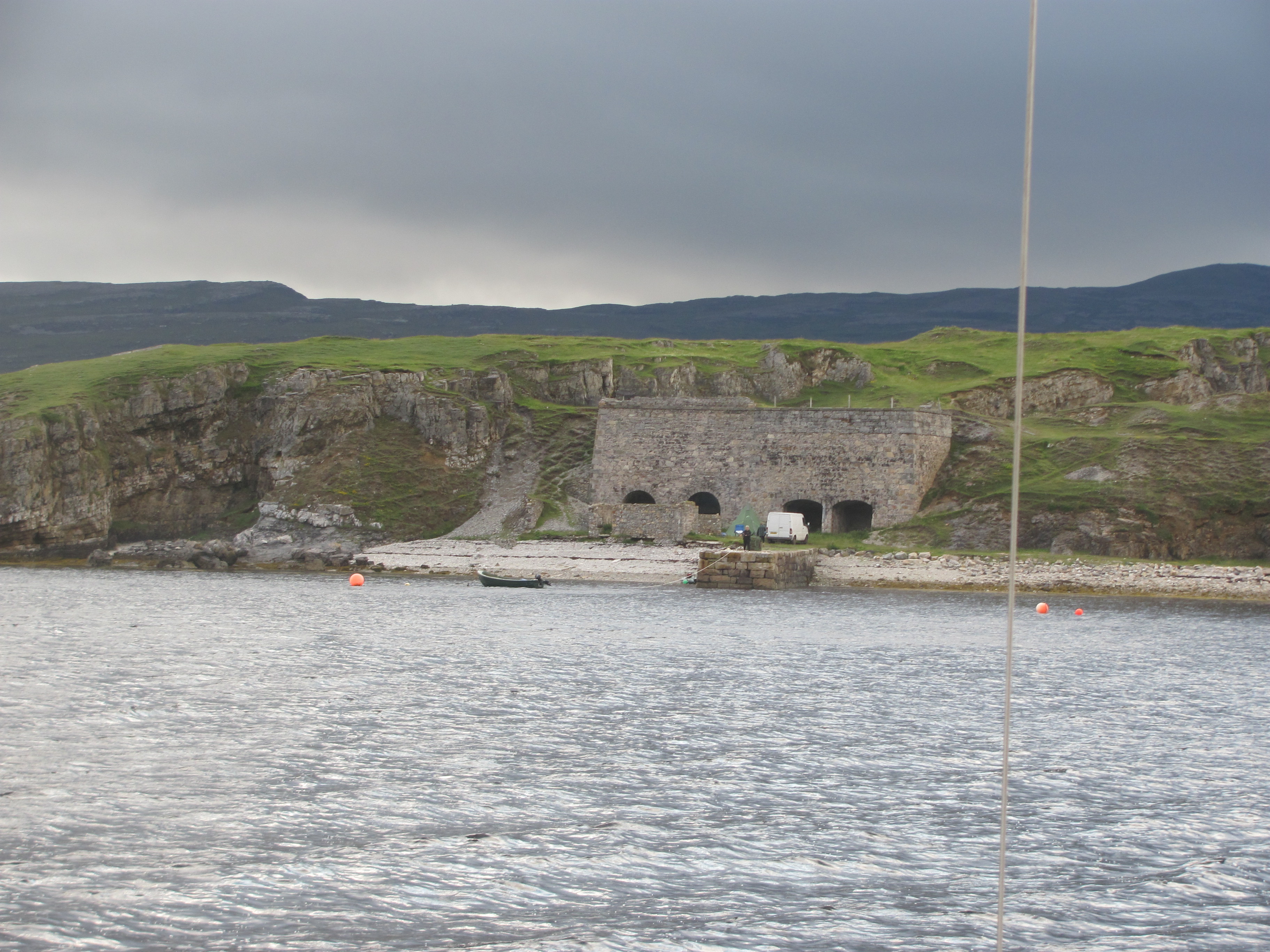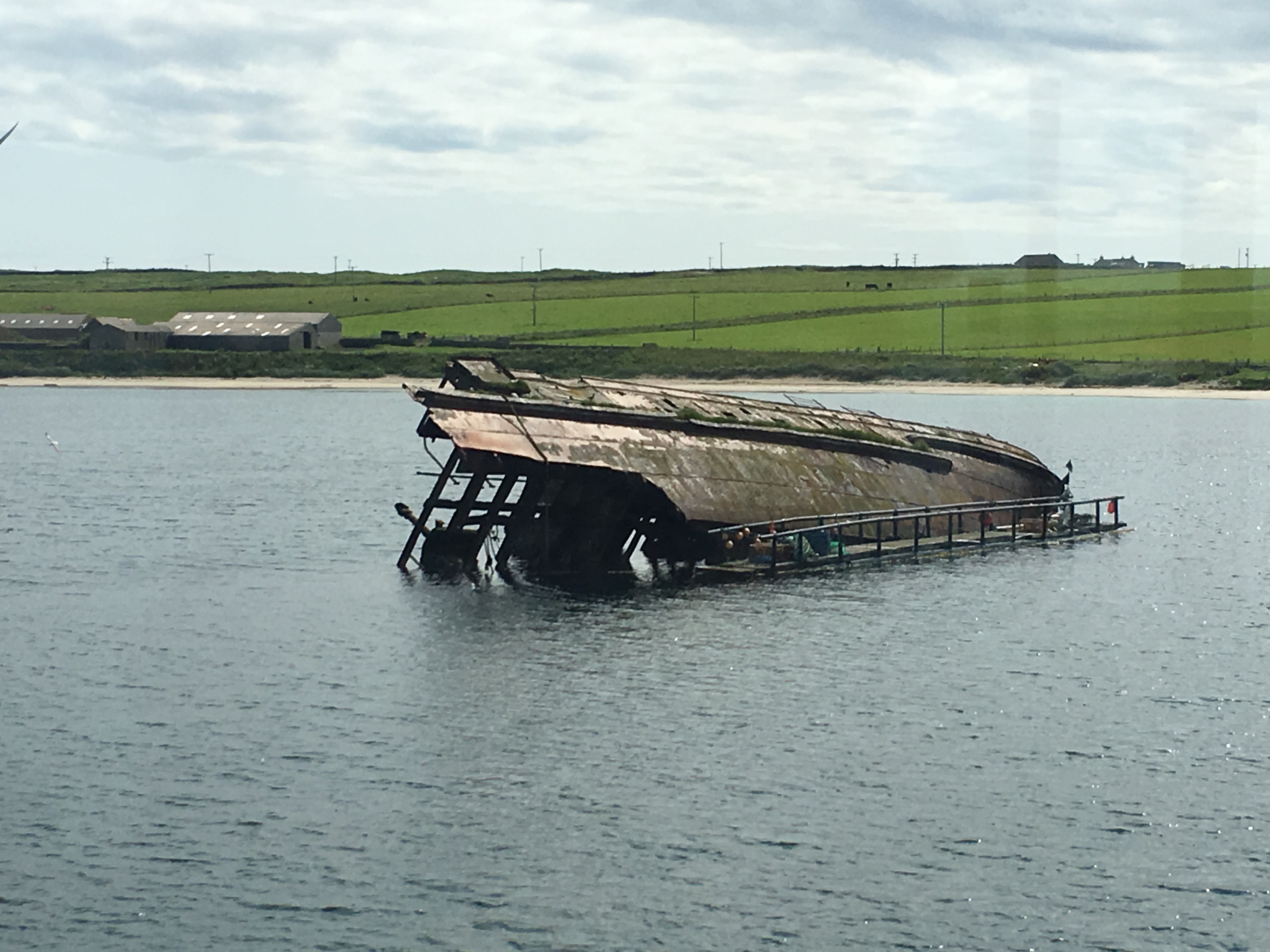 We arrive in the Sound in the late afternoon and anchor near one of the rusting blockships that were sunk deliberately to prevent access by German submarines to Scapa Flow during WW2. Just in case there is still wreckage on the seafloor that might trap our anchor, we rig a trip line with a buoy floating on the surface.