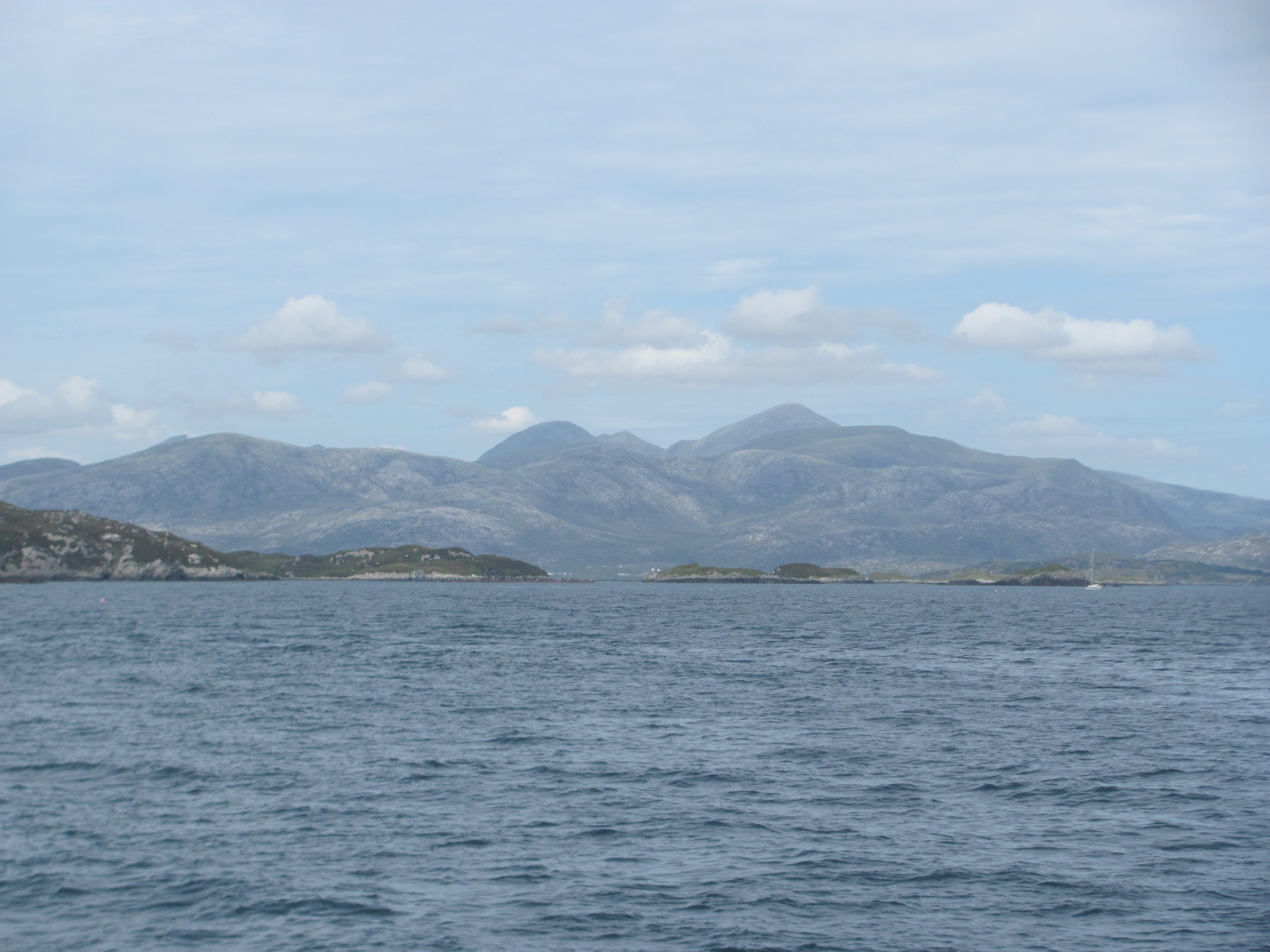 We leave Lochmaddy harbour and continue northwards. The wind is coming from the north-east, so we have to sail as close-hauled as we can. We get to Rodel, with its 16th century Church of St Clements and Roineabhal, the anorthosite mountain, towering behind, and need to take a tack to pull away from the shore. We had visited Rodel in 2015 in our small boat and moored in the pool that can only be entered and exited at high tide. However, we had heard that the hotel at Rodel has now closed, that the three visitors moorings there are not maintained, and that there is ground tackle that has been left, making it difficult to anchor. It was good that we saw it when it was still a delightful place to stay.