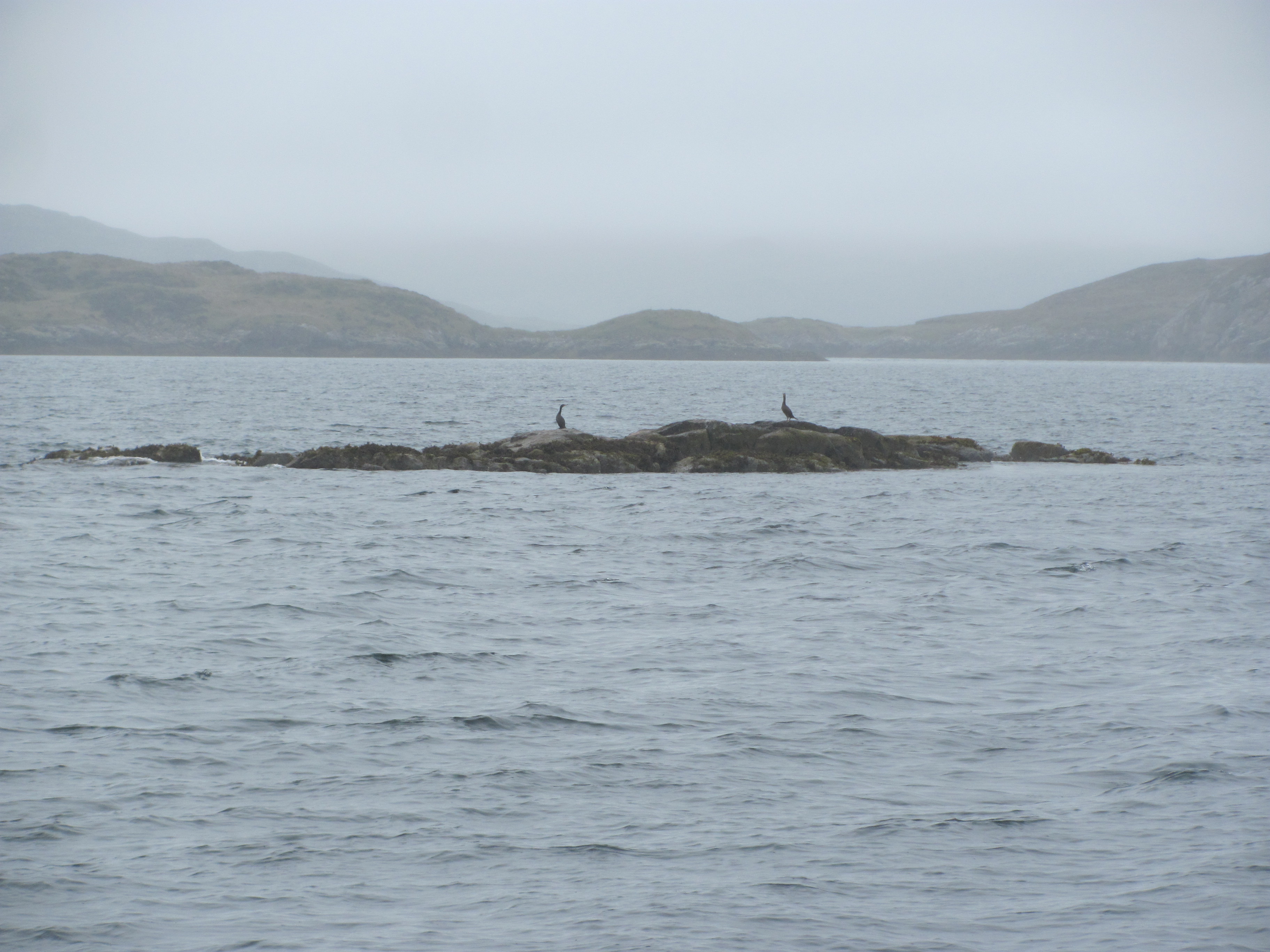 We leave Scalpay the next day, heading for Stornoway. Two cormorants on sentry duty mournfully watch us go. The fog is low, and we can’t see much of the land we are passing, but at least at sea level we can see enough to avoid other boats. We motor out to the Eilean Glas lighthouse that we were aiming at on our walk yesterday, switch off the engine, pull the sails out, and turn north.