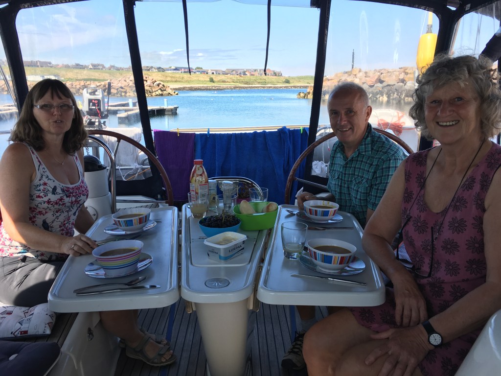 The next day, our friends Uli and Ian arrive and come down from the car-park to the pontoons where we are tied up. They live not too far away from Peterhead, and have kindly offered to come and collect us and take us back home, saving us a complicated bus ride. It is great to see them again. The First Mate makes a soup and cuts the bread into slices. I clear the table.
