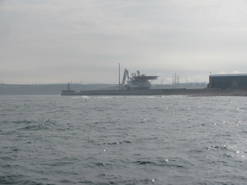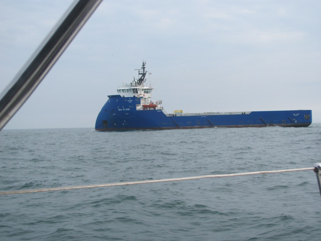 Not wanting to come off second best with one of the massive supply ships, I put the engine in gear and let it tick over so that we can circle around on the same spot. Before long, we see the supply ship coming out through the entrance to the harbour. It towers over us as it passes, and Ruby Tuesday wallows in its wake like a cork.
