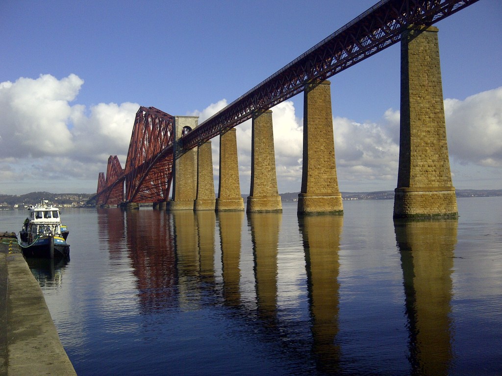 We find a bakery we passed back along the street, buy a prawn baguette to share, and sit down on a seat overlooking the Firth of Forth and the iconic railway bridge. A train rattles over it, dwarfed by the giant girders glowing ochre in the sun. I idly wonder if any of my ex-colleagues are on it. Below us a group of cyclists in day-glo jackets wheel their bikes out to the end of a stone jetty and take in the view. It is stunning.