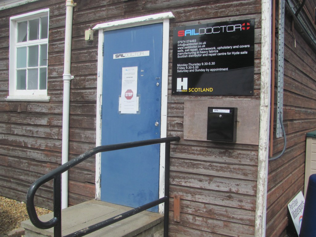 In the morning, I take the mainsail down, fold it up and load it into a trolley, and trundle it along the pontoons and up the steep ramp at the end. In the group of buildings at the end of the pier is an unprepossessing door with a sign next to it announcing the whereabouts of the Sail Doctor. On the door is notice saying that entry is prohibited due to covid-19 and to ring the bell and someone will come. This I duly do, and after a short wait, the door edges open and Chic the Sail Doctor appears.