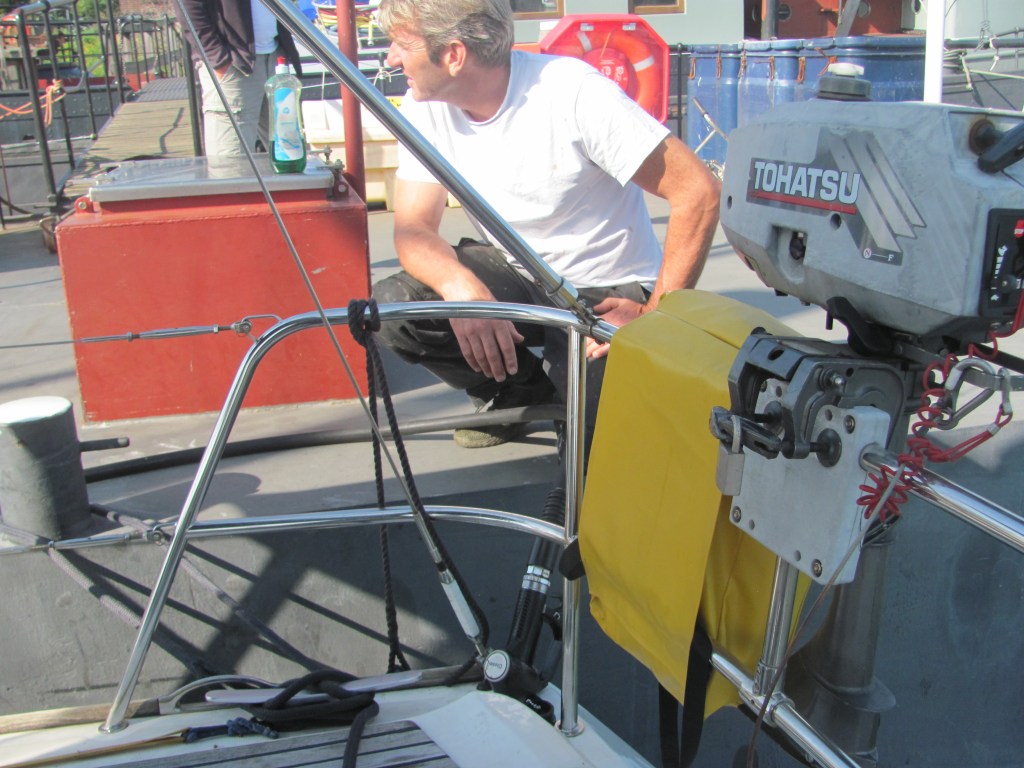 I grab the boathook and try to reach the mat. It starts to go under just like the map did on Oosterscheldte. I manage to hook it from underneath and then try to manoeuvre it out, but it slips and starts to sink again. Luckily it is near the pontoon by this stage, so the First Mate lies down and manages to grab it just before it disappears into the depths.