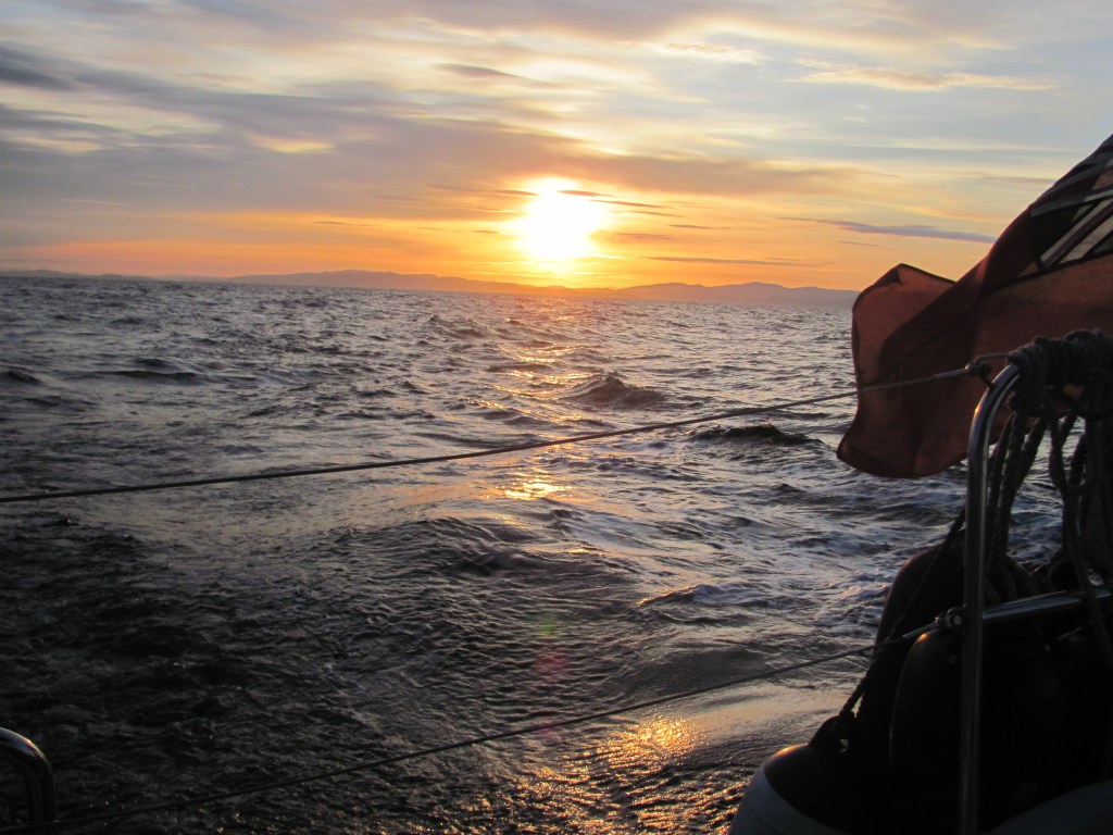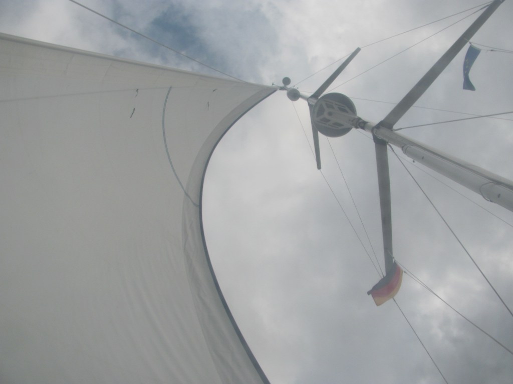 Lost in my reverie, it takes me some time to notice that the wind has dropped to almost nothing, and also seems to have changed direction. We are almost motionless. The boat following us a little way behind us is in the same predicament. We both try to tack northwards to catch some wind, somewhat unsuccessfully. A few seconds later we heel violently as an intense gust of wind out of the blue catches us and spins us around.
