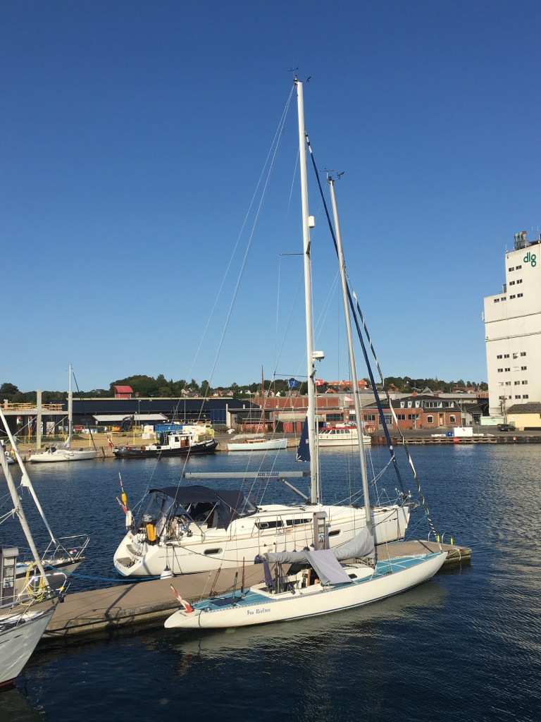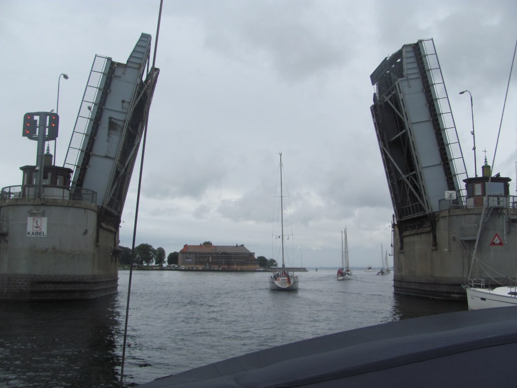 We approach Svendborg, following the narrow buoyed channel under the massive traffic bridge that spans the sound. Far above us, we can hear the hum of the cars and lorries crossing from one side to the other.