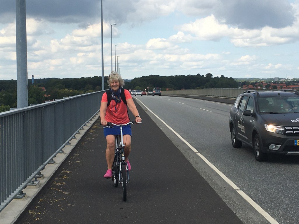 We unload the bikes and set off. To get to the island, we need to cross the Svendborg Sund Bridge that we had sailed underneath as we arrived. From sea level it towers over us, and I wonder how on earth we are going to manage to get up there on our little bikes. Luckily, the route to it curves around gently, and before long we are on top of the bridge looking down. The view is spectacular. Below us, two yachts are just about to go under the bridge, and in the distance, we can see the harbour where Ruby Tuesday is tied up.