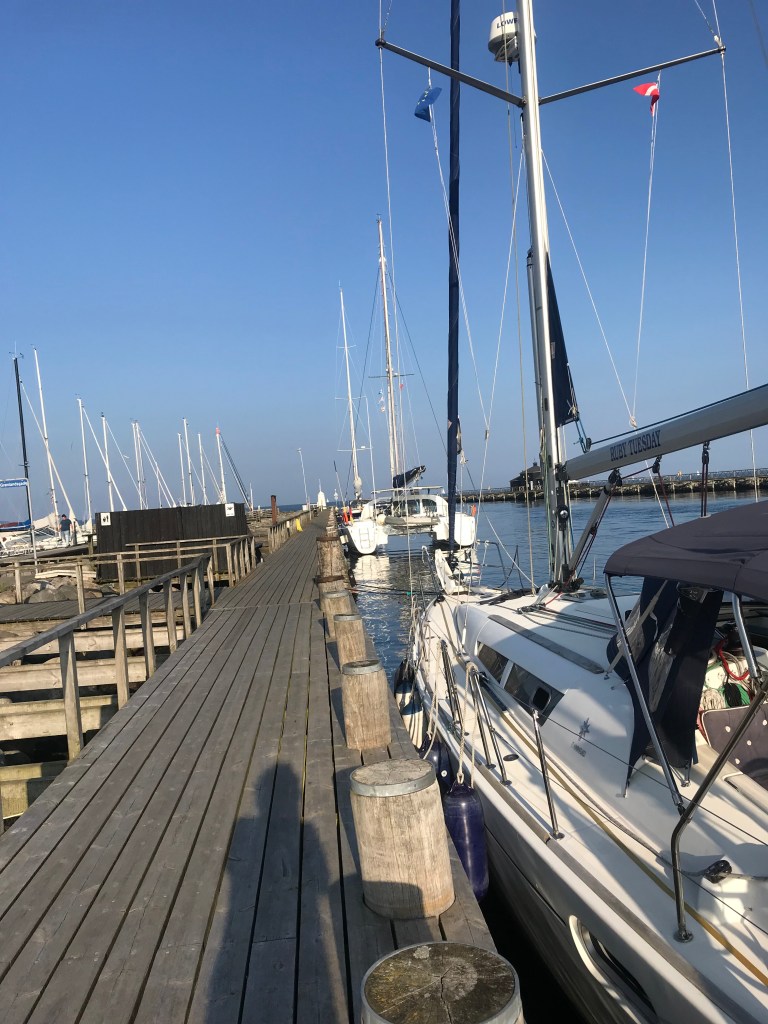As we approach Ærøskøbing, the rain eases. We follow the marker buoys into the marina on the right. The wind is still strong, so we opt to tie up alongside the outer pontoon rather than a box berth, and let the wind blow us onto it.