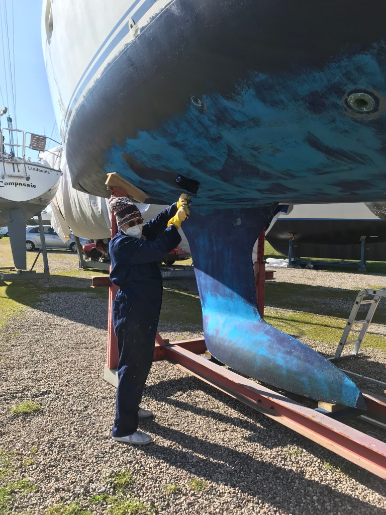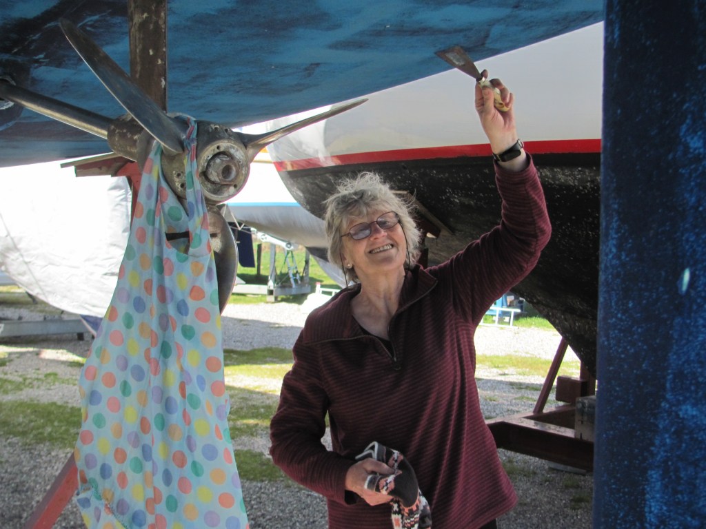 We spend the next week preparing Ruby Tuesday for launching. With her out of the water, it makes sense to take the opportunity to antifoul her. The last application had been done at Ardrossan on the west coast of Scotland three years previously, and it had lasted well given that it is supposed to be done every year or so. The next couple of days we spent underneath the hull scaping off any loose material and painting on the new dark blue layer with a roller brush. The latter is messy work and I need to cover up.