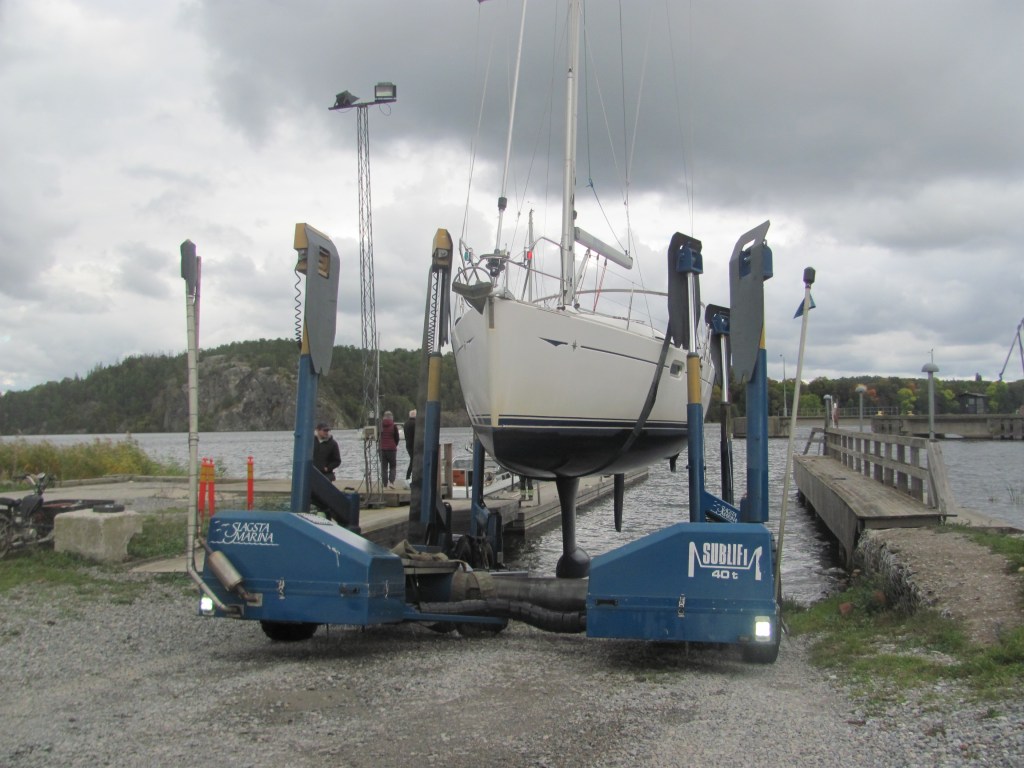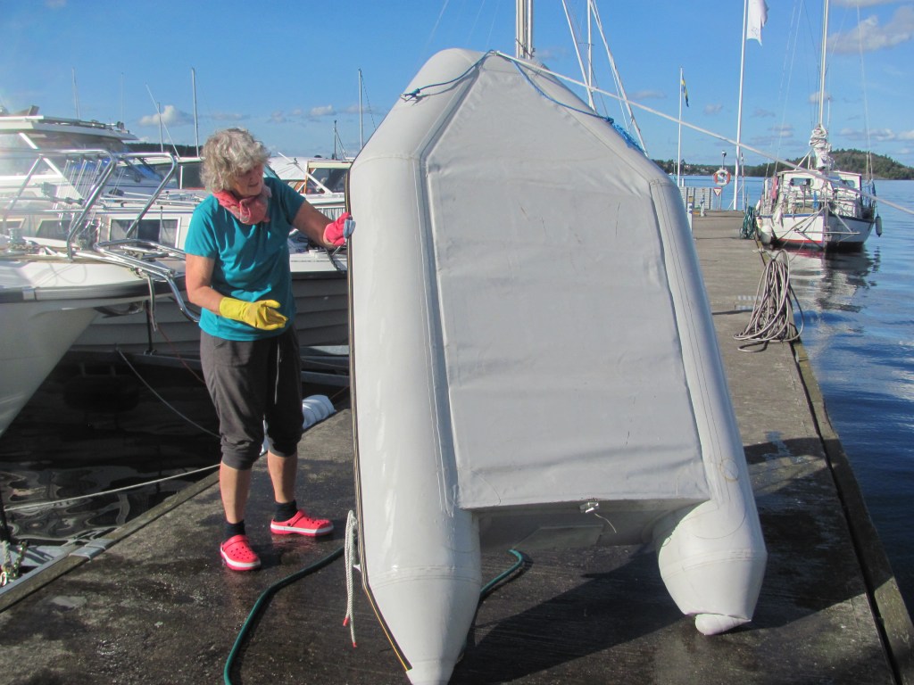Back at Slagsta Marina, we spend the next few days preparing Ruby Tuesday for lifting out. Down come the sails, the bimini, splash hood, and the cockpit tent. The oil and fuel filters are replaced, and both engine and gearbox get new oil. Ropes are washed and stowed away. The fuel tank is topped up to avoid condensation and biocide added to prevent growth of diesel bug. The rubber dinghy is cleaned and stowed.