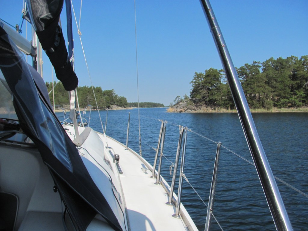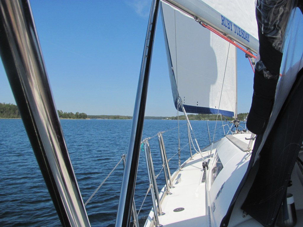 After breakfast, we weigh anchor, take the north channel from Paradiset, and thread our way gingerly through the rocks and skerries that litter the way. On several occasions it looks as if the obvious route should be straight ahead, but we put our trust in the GPS and the charts and make several dog-legs to skirt around the hazards lurking just below the surface.