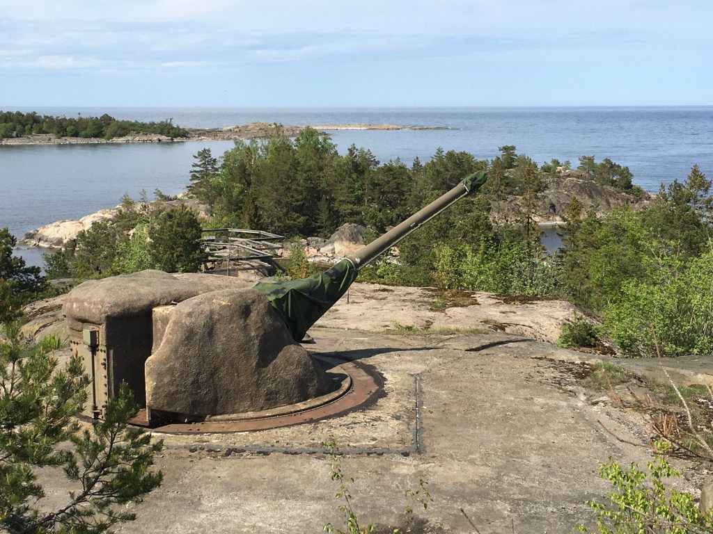 After lunch, we walk through the forests to the northern end of the island where the Arholma Battery is located. Preparations are underway for a wedding there the next day. We climb to the top of a rock outcrop to find the remnants of an early warning system to detect incoming missiles and a large 10.5 cm Bofors gun pointing eastwards out to sea.