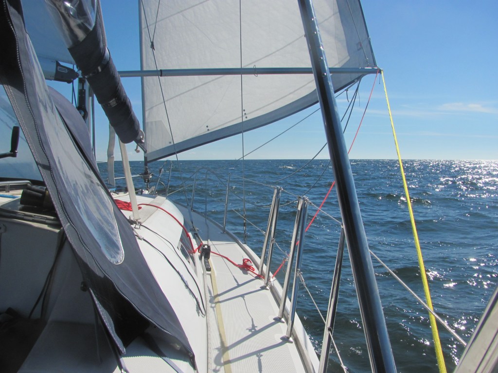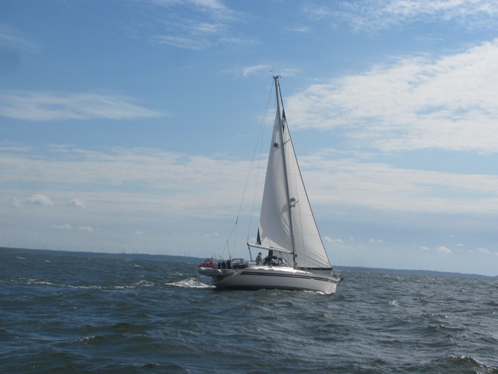 We continue our journey southward the next morning. The wind is almost direct from behind, and there is not much of it. With both sails out in the conventional manner, the genoa flaps uselessly in the wind shadow of the mainsail. We manage a majestic two knots.