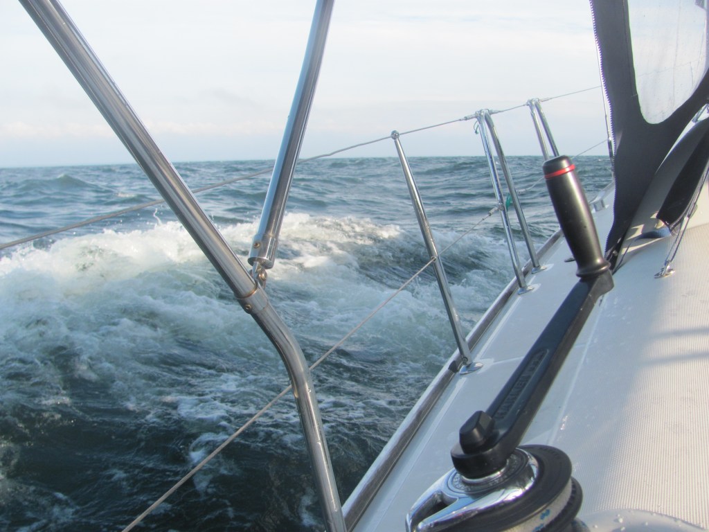 The wind is on our nose from the southeast and blowing around 18 knots with gusts up to 26 knots. The sea is also rough, being whipped up by several days of southerly winds. We take a long tack close-hauled out to sea, then back in again. It’s an uncomfortable passage.