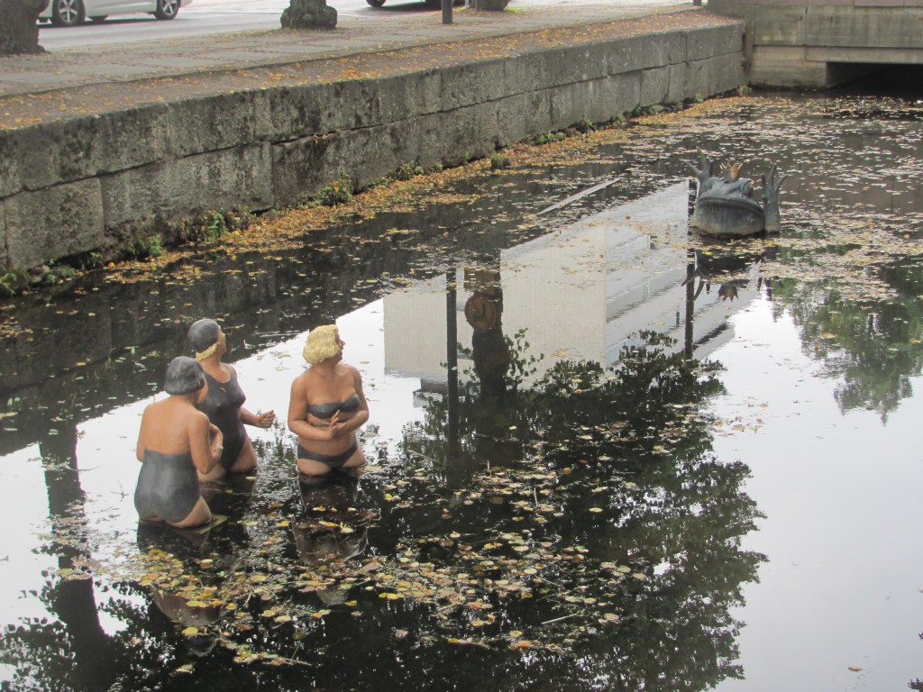 “Look at these wooden sculptures in the stream”, says Catherine, as we come to the town centre. “Three women looking apprehensively at the frog prince. That’s original.”