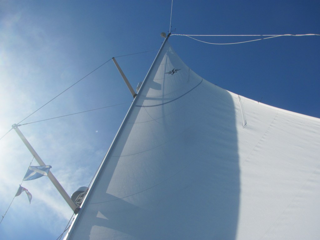 But the wind picks up as we clear the headland, and before long we are unfurling the sails and are sailing along on a comfortable broad reach. We see Compromise to the south still motoring.