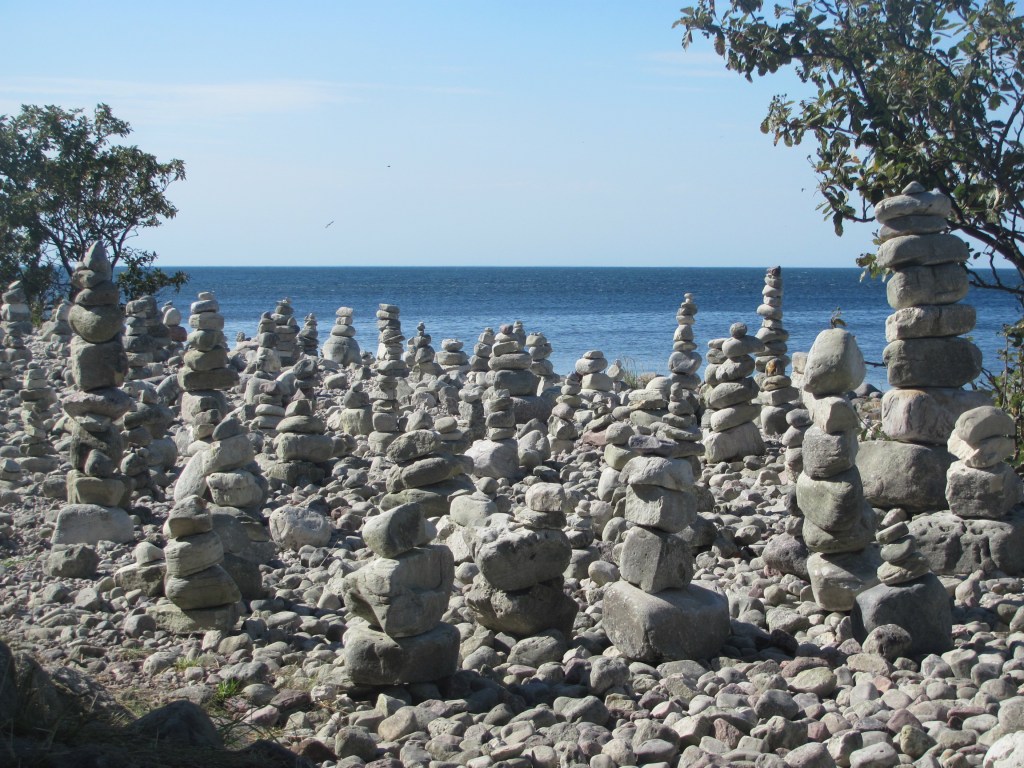“Come and have a look at these piles of stones on the beach”, calls the First Mate from behind the lighthouse. “They look like an army of invaders from the sea. I wonder how long they will stay up in this wind?”