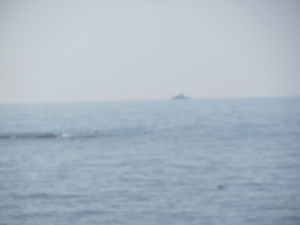Sure enough, in the haze of the horizon we see a warship firing its guns, puffs of smoke being carried away by the wind.