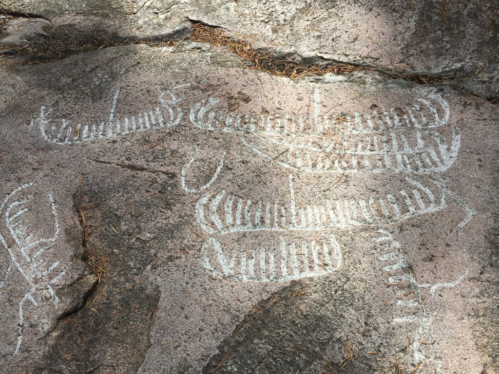 It’s the First Mate. We are visiting the Bronze Age petroglyphs at Hällristningar på Hästhallen, just to the north of Sandhamn. We had cycled out with Klaus & Claudia after lunch, turned off the main road and walked to the rock outcrop in a small clearing. We had spent the last half-an-hour or so marvelling at the 140 carvings of ships, horses and riders, deer, sun wheels, soles of feet, and cup marks. I am imagining how they might have come to be there.