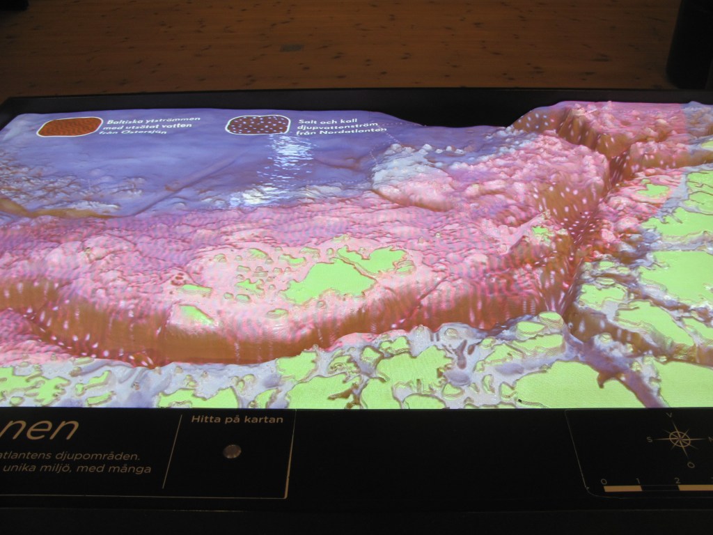 “It’s a deep trench that curves all the way around the south of Norway, up to the Oslofjord, then a bit down the west coast of Sweden just past the Koster Islands”, the Enthusiastic Ecologist explains, leading us to a scale model lit with pulsating lights. “It’s up to 700 m deep in places, and up to 95 kilometres wide. A current flows along it bringing water from the Baltic to join the Norwegian Coastal Current along the west coast of Norway. These pulsating lights show you the currents.”