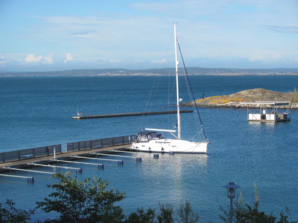 After breakfast, we push on to the Koster Islands, about 12 miles west of Strömstad. We arrive at Ekenas, the main harbour. There is a strong current through the narrow channel in which the marina is located, and it is not easy to tie up. The neighbours help us, but somehow we still manage to nudge the pontoon and take a small chip out of Ruby Tuesday. I am not very happy.