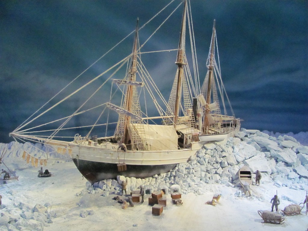 “The Fram was commissioned and used first by the Norwegian polar explorer Fridtjof Nansen in 1893”, a panel tells us. “It was used to test his theory that there was an east-west current across the north pole. By trapping the Fram in the ice around the Siberian islands, they found that it emerged into the North Atlantic Ocean after three years, partly proving the theory, although it didn’t cross the actual North Pole.”