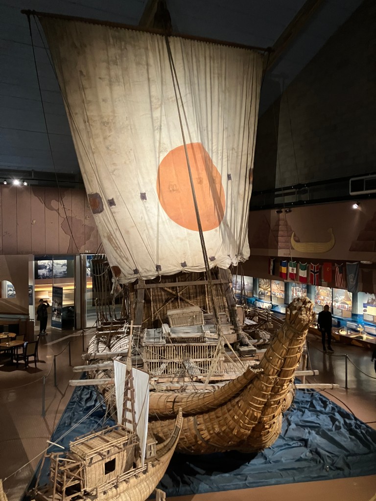 “It didn’t seem to deter him, though”, I say. “Another of his theories was that the Ancient Egyptians could have sailed across the Atlantic to trade with the inhabitants of the Americas. So he built another raft called the Ra out of papyrus. After one failure, he rebuilt it and managed to sail from Morocco to the Caribbean in 1970, again proving that it was at least possible. I remember keeping a scrapbook on it when I was at high-school.”